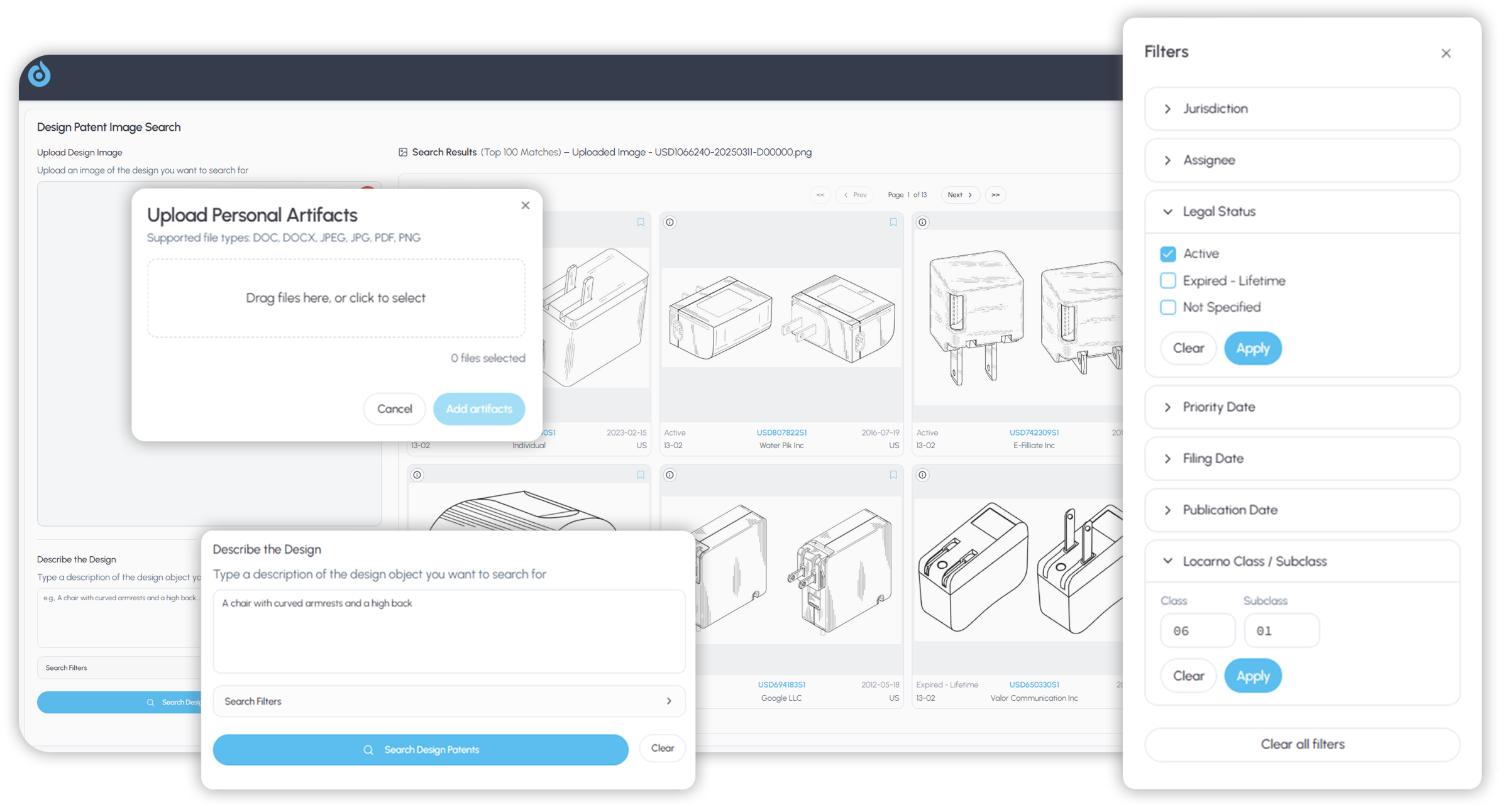 Set the scope of your search upfront or refine your search later. Filter by Locarno class, jurisdiction, assignee, legal status, and priority, filing, or publication dates — at any point in your search.